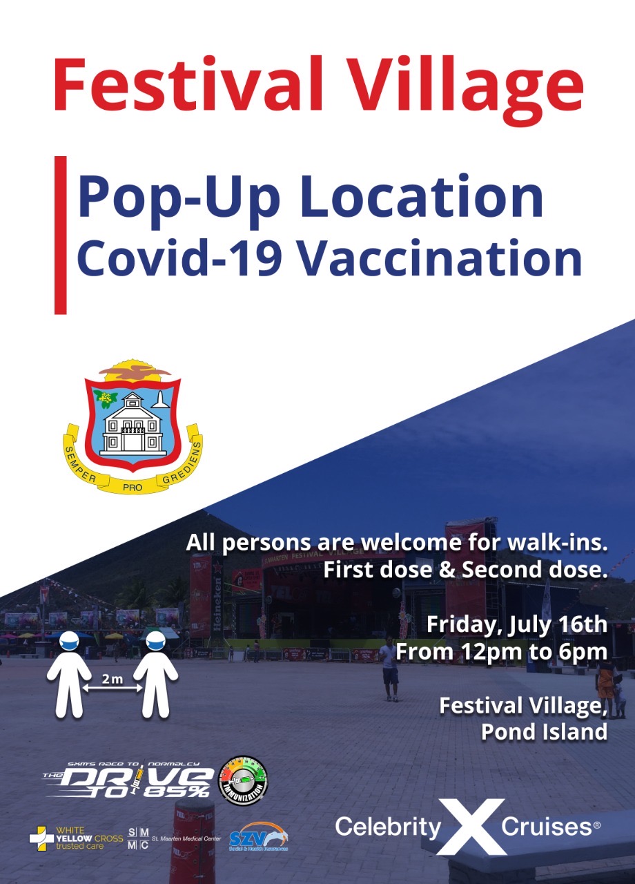 All persons 12 years and older are encouraged to come for their COVID-19 vaccination at the pop-up location at the Festival Village on Friday, July 16th, from 12:00 PM to 6:00 PM, or on Saturday, July 17th from 9:00 AM until supplies last at the Kimsha Beach parking lot in Simpson Bay.