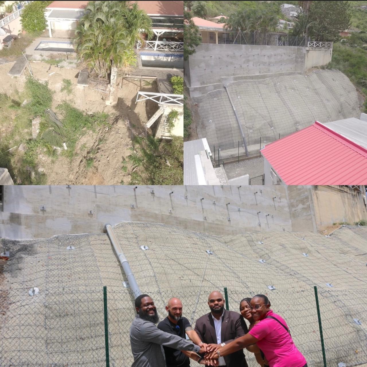 Foto compuesta: Ladera derrumbada con fosa séptica y cisterna faltantes; ladera reparada; y el Ministro Gumbs (centro) con el Jefe de Gabinete Luciano Nicholls (izquierda), el Sr. Ripert (segundo por la izquierda) y dos residentes de Ebenezer and Valley Estate en la entrega del terreno el miércoles pasado.