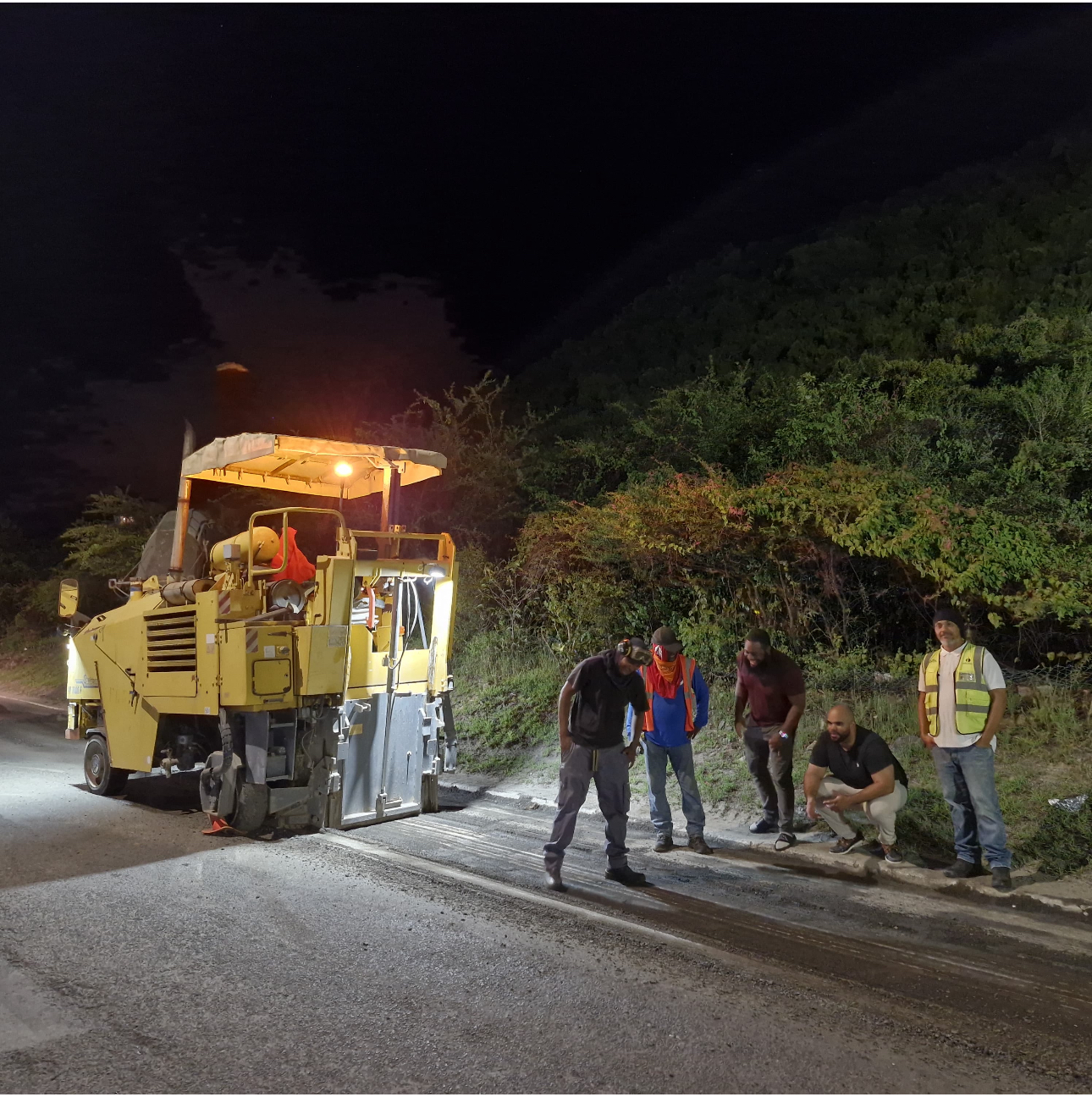 FOTO: El Ministro de VROMI, Patrice Gumbs (arrodillado), inspecciona las reparaciones en curso junto con el Asesor de Políticas del Gabinete, Luciano Nicholls (centro), el Asesor de Políticas de Infraestructura de VROMI, Byron Isebia (derecha) y representantes de Windward Roads (izquierda).