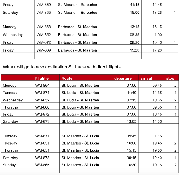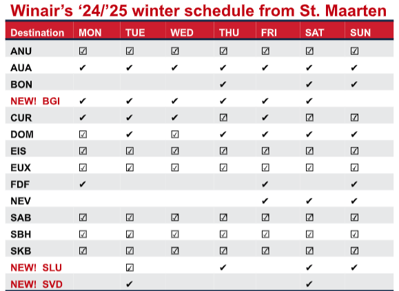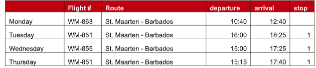 A partir del 15 de noviembre de 2024, Winair operará 6 vuelos semanales entre St. Maarten y Barbados. Además, Winair también ofrecerá vuelos directos desde Barbados a St. Lucia 2 veces por semana, Martinica 2 veces por semana y Dominica 3 veces por semana.
